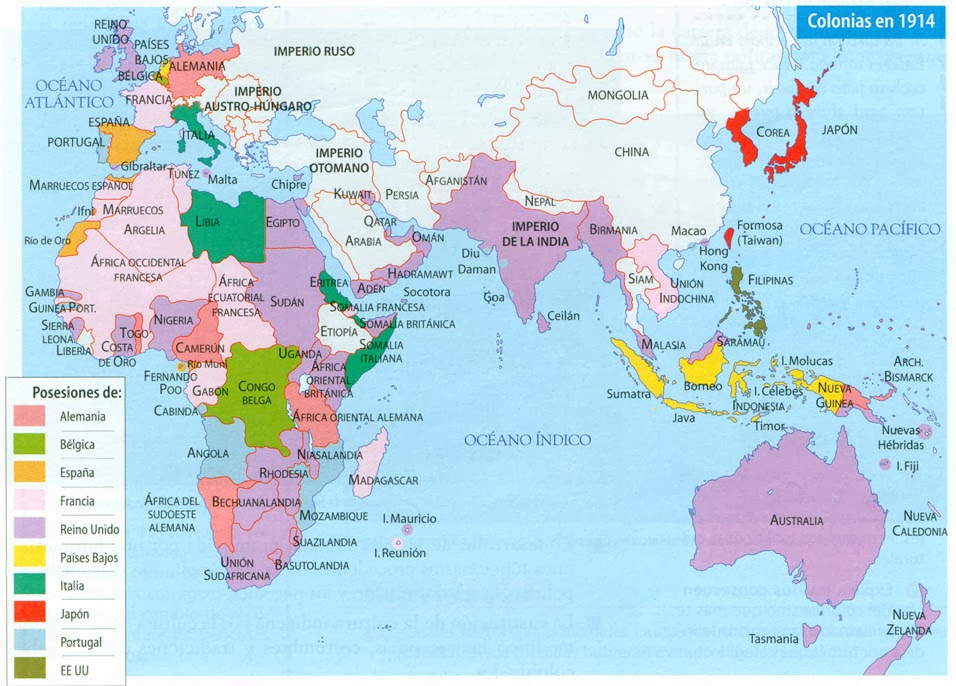 «Hacia 1870 surgió en el mundo una nueva forma de imperialismo. Aparecieron nuevas potencias coloniales que llevaron a cabo la conquista de la mayor parte del mundo. Los principales imperios europeos fueron el británico -el mayor de la época-, el francés, el alemán, el belga y el italiano; también hubo imperios no europeos, formados por Estados Unidos y Japón.